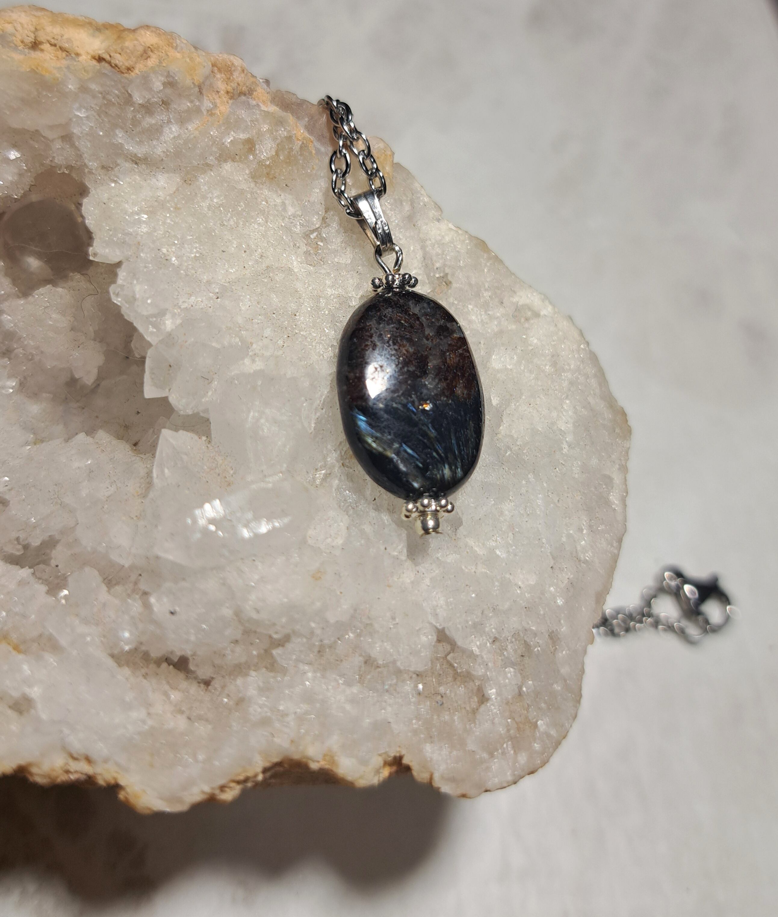 青や金のシラーが美しい複数の鉱物の複合石です。